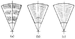 箅板孔的排列方式很多,常用的是同心圓排列和輻射狀排列。同心圓排列(圖 1-17(b))的孔是平行于物料和研磨體的運(yùn)動(dòng)軌跡。因此,對(duì)物料的通過(guò)阻力小,通過(guò)量較多,且不易堵塞,但過(guò)去的物料容易返回,而輻射狀箅孔(圖1-17(a))與此相反。對(duì)于雙層球磨機(jī)隔倉(cāng)板上的箅板由于不存在物料返回問(wèn)題,從而消除了同心圓排列的缺點(diǎn),而保留其優(yōu)點(diǎn)。因此,雙層隔倉(cāng)板的箅孔通常都是同心圓排列的。為便于制造,同心圓排列常以其近似形狀代替,形成多邊形排列,如圖1-17(c)所示。輻射狀箅板對(duì)研磨體有牽制作用,使靠近箅板附近的研磨體有較大的提升高度,于是在空腔中出現(xiàn)了球面的高差,因而使集聚于球載輪廓中部為數(shù)較多的大研磨體優(yōu)先移向隔倉(cāng)板,同時(shí)將小研磨體陸續(xù)排擠到另一端。所以,卸料箅板不宜采用輻射狀箅孔。