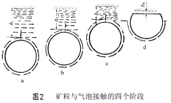 最后階段d是礦粒與氣泡接觸。從情況c,自發(fā)進行到d,此時礦粒與氣泡開始接觸。接觸發(fā)生后,如為疏水礦物,接觸周邊可能繼續(xù)擴展。