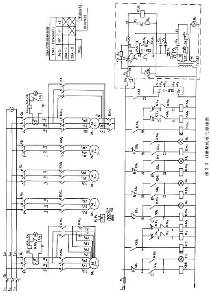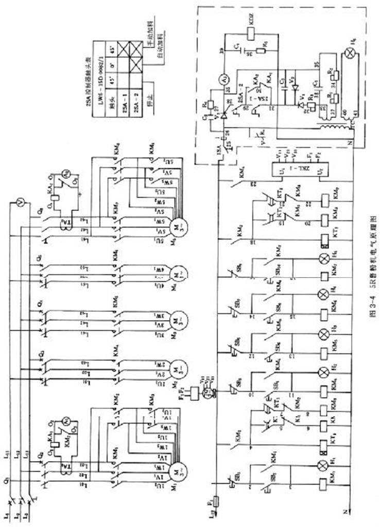 電機(jī)、電磁振動(dòng)給料機(jī)及分級(jí)機(jī)的常見(jiàn)故障及排除方法見(jiàn)表3-1,3R、4R 和 5R磨粉機(jī)電氣原理分別見(jiàn)圖3-2、圖3-3和圖3-4。
