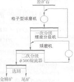 通過對當(dāng)時(shí)生產(chǎn)工藝流程的考察與計(jì)算,發(fā)現(xiàn)制約提高生產(chǎn)處理能力的瓶頸主要在磨礦和選別作業(yè)。破碎和脫水只須作適當(dāng)調(diào)整即可滿足改造后的工藝需求。